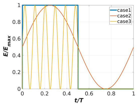 In the first case, a square function with a duty cycle of 0.5 (Figure 8) was used to model the energy deposition. The second case employed a sinusoidal law for the temporal variation of energy deposition. Frequencies corresponding to fmod = 500, 750, 1250, and 1700 Hz were considered for the first and second methods. In the third case, energy was deposited according to a sinusoidal law at the carrier frequency of 17 kHz, which was modulated by a square function with a duty cycle of 0.5 at frequencies fmod.