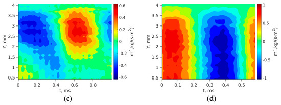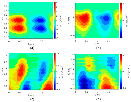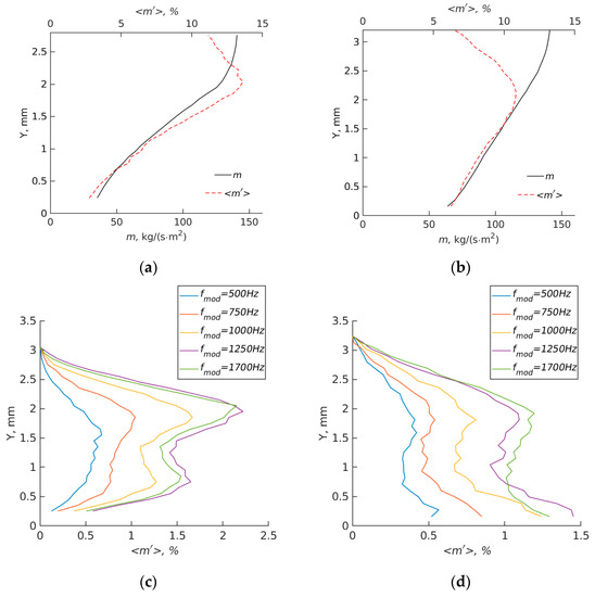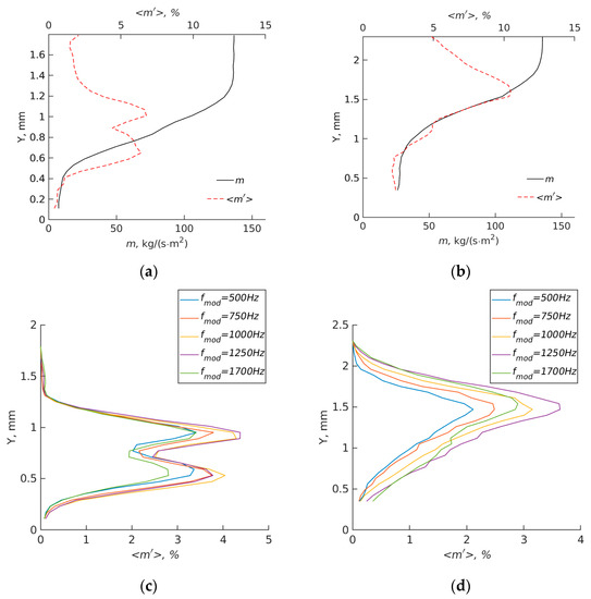 As we move further downstream to X = 150 mm (Figure 11d), significant differences in the distribution of the RMS fluctuations induced by the discharge can be observed depending on fmod. For the low frequency fmod = 500 Hz, the maximum fluctuations are located near the wall and, as the distance from the wall increases, there is a monotonic decrease of their amplitude. For frequencies fmod = 750–1250 Hz, the maximum RMS values are observed in the region Y ≈ 3 mm, and the disturbance magnitude decreases close to the wall. For the maximum frequency fmod = 1700 Hz, the RMS fluctuations of mass flow rate are approximately constant in the whole boundary layer region. From Figure 9, Figure 10 and Figure 11, it is evident that there is a predominantly decreasing trend in the amplitudes of disturbances introduced by the discharge as we move downstream. In the X = 160 mm section, the disturbances induced by the discharge approach zero and are therefore not discussed.