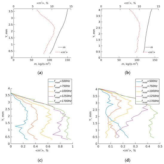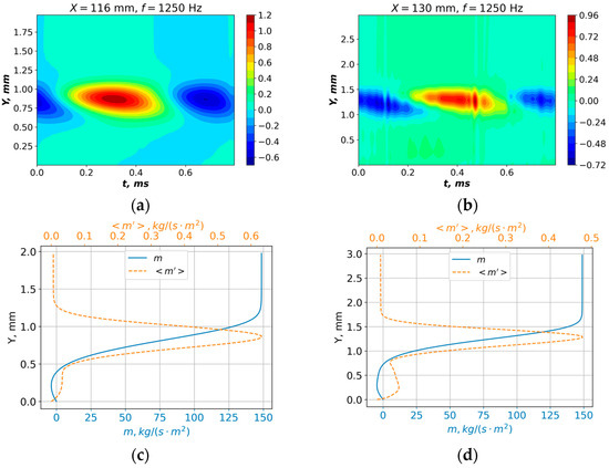 (a,b) Oscillogram of the disturbances of mass flow, (c,d) distribution of the mean value and RMS of mass flow rate at fmod = 1250 Hz, case 2 ((a,c)—X = 116 mm, (b,d)—X = 130 mm).