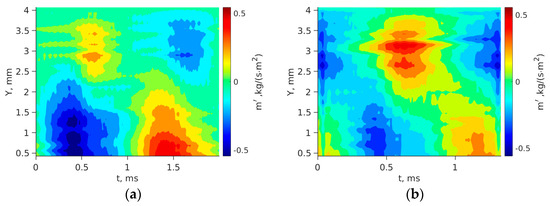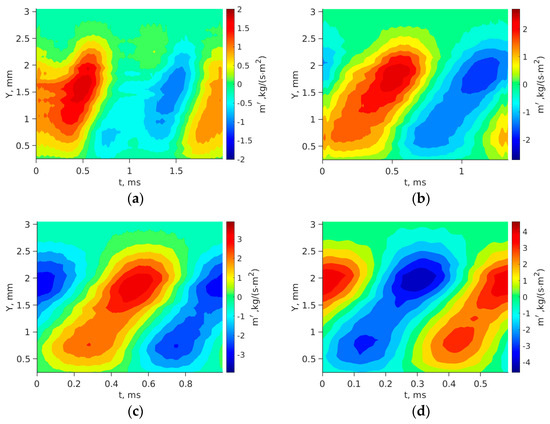 Figure 14 presents data similar to Figure 13 but obtained in the wake region (X = 150 mm). In contrast to the data obtained in the downstream part of the separation region (X = 130 mm), changing the frequency leads to significant restructuring of the oscillogram of mass flow rate in the boundary layer. For instance, at the maximum frequency of fmod = 1700 Hz, the change in mass flow rate occurs with a single phase along the entire boundary layer, whereas at the frequency of fmod = 750 Hz disturbances near the wall are out of phase with disturbances near the boundary layer edge. One possible explanation for this phenomenon is the presence of two distinct disturbances in the wake (near the wall and near the boundary layer edge) propagating with different phase speeds.