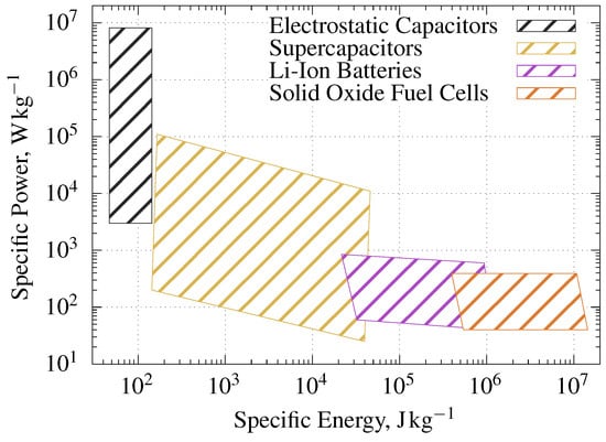 As far as electric flight is concerned, drones and other remote controlled aircraft have surpassed the state of simply being used by hobbyists and have found numerous applications in a variety of industries. Indeed, even small low-speed short distance electric passenger aircraft are already a reality. However, electric high-speed and supersonic flight have not been achieved to date. The biggest hurdles are the aforementioned specific power and specific energy of electric energy storage systems (EESS). Figure 1 shows the typical specific power over the specific energy of different EESS.