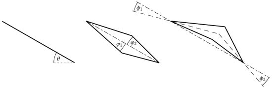 where , and and , respectively, are positive when the respective wedge axis is tilted towards the windward side of the blade and negative when the respective wedge axis is tilted towards the leeward side, i.e., in Figure 4 both and are positive. If either (4) or (5) are equal to zero, two sides of the four-sided blade coincide with the cord and it becomes effectively three-sided.