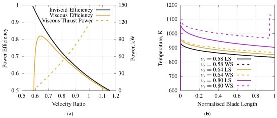 Figure 6a shows a comparison of the inviscid power efficiency with the viscous power efficiency of the standard configuration. The thrust power of the viscous blade is also shown. As is evident, the inviscid power efficiency approaches 1 where . At this point, , i.e., is parallel to the blade. Here, the blade cannot produce any thrust as there is no pressure difference across it; thus, the net force is zero. The viscous efficiency and thrust power at this point are actually negative because the viscous forces oppose the forward motion of the vehicle and the rotation of the propeller, i.e., the motor has to deliver power to maintain its speed, but the vehicle is accelerated backwards. Viscous effects become less significant at higher because the magnitude of the inviscid forces increases relative to the magnitude of the viscous forces. From an operational point of view this has important implications since a small change in conditions can result in a very large difference in power efficiency, and, in fact, a complete loss of thrust, at lower . The same change in conditions at higher , however, is of little consequence. However, operational safety has to be balanced with efficiency and, as Figure 6b shows, increasing blade temperatures.
