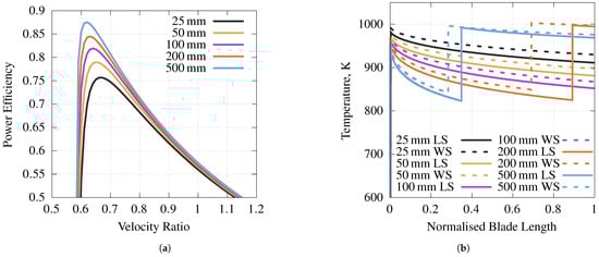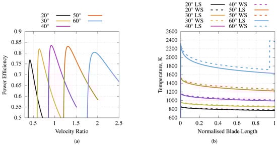The effect of varying on the power efficiency and the temperature distribution at maximum efficiency. (a) shows the power efficiency of each blade and (b) shows the wall temperature distributions.