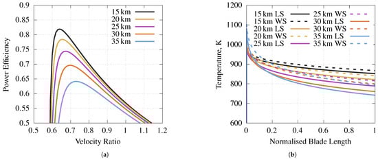 While there is a very significant drop in efficiency, the standard blade still achieves well over 60% power efficiency. The temperature distributions in Figure 11b show the competing effects of a higher velocity ratio and a lower density. At the leading edge the boundary layer is equally small regardless of the flight altitude. The wall temperature is, thus, only a function of the flow temperature near the wall. Since the efficiency maximum at 35 km is at a higher velocity ratio than at the other altitudes, the shock at the leading edge is strongest and the wall temperature peak is the highest. Further along the blade, the high density at 15 km dominates the heat transfer to the blade; hence, the lowest altitude results in the highest temperature for most of the blade length. A higher freestream density results in a higher Reynolds number, which causes the boundary layer to be thinner and the heat transfer, thus, to be higher. However, none of the blade temperatures shown appear to be problematic.