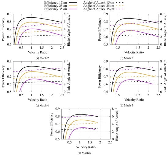 Power efficiencies and the blade angle of attack at the optimal cord angle for a given velocity ratio at (a) Mach 2, (b) Mach 2, (c) Mach 2, (d) Mach 5 and (e) Mach 6 and 15 km and 35 km altitude.