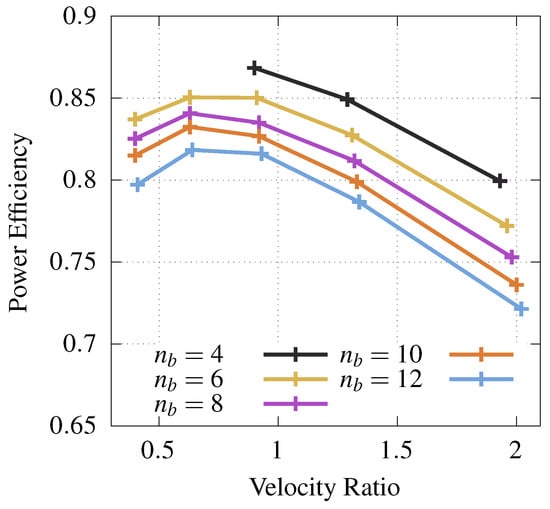 Data points, which are approximately vertically aligned, are at the same cord angle. Note that, as expected, the smallest number of blades results in the largest power efficiency at each cord angle. Furthermore, note that the minimum power efficiency is well above 0.7. Hence, each propeller provides good performance. Comparing Figure 14 to Figure 9a, we can see that the efficiency maximum has shifted from between and to between and for each curve of constant . This is because the increase in cord length compensates for the loss of efficiency from reducing . However, the opposite effect can be seen for . Both the increase in and the decrease in cord length cause the efficiency to be reduced. The efficiency curves are thus steeper than in Figure 13.