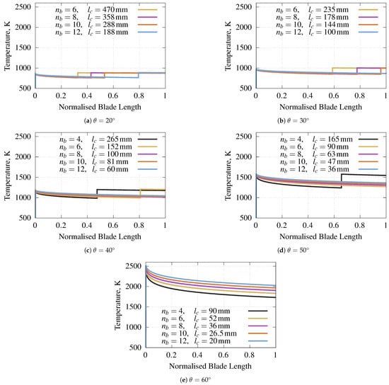 Temperature profiles of the blades at (a) , (b) , (c) , (d) and (e) .