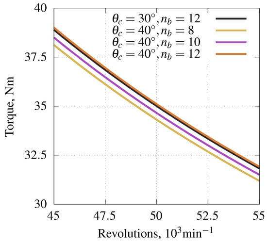 Varying the hub radius has no effect on either the power efficiency with respect to the velocity ratio or the temperature distribution on the blade. However, it does affect the requirements for the electric motor. The power of the motor is the product of rotational speed and torque, i.e., the same amount of power can be delivered using high torque and low rotational speed or low torque and high rotational speed. The hub radius dictates which combination of the two is required to achieve a given velocity ratio and, therefore, desired efficiency. In Figure 10, the motor torque over rotational speed is shown for five different .