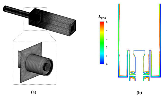 (a) Computational domain mesh. (b) Contour of mesh quality according to the criterion (Equation (10)).