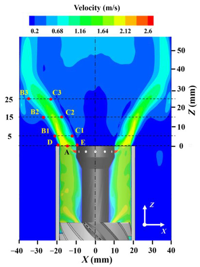 Nine monitoring points were strategically placed on the y = 0 plane of the computational domain, as shown in Figure 3. These monitoring points were specifically chosen to capture the behavior of the inner shear layer (ISL), outer shear layer (OSL), and vortex ring generation regions. Monitoring point A was positioned at the center of the inlet annulus while monitoring points B1 to B3 were located near the outer shear layer. Similarly, monitoring points C1 to C3 were placed near the inner shear layer, and monitoring points D and E corresponded to the regions where the outer vortex ring (OVR) and inner vortex ring (IVR) were formed. The coordinates of each monitoring point are presented in Table 1.