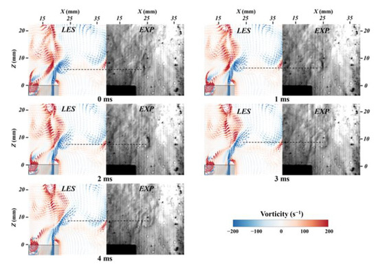 The accuracy of the numerical results was validated by comparing the vortex motion obtained from the schlieren images with the vortex motion calculated using LES. The reliability of schlieren imaging in validating LES has been established in previous studies [28].