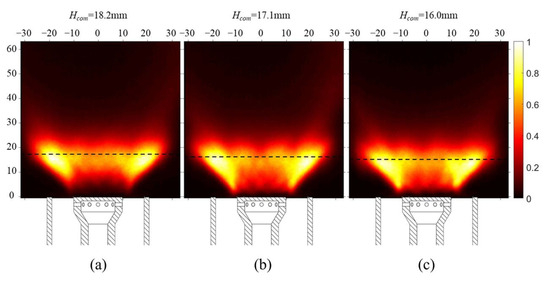 Figure 5 illustrates the time-averaged distribution of CH* chemiluminescence in the flame. The center of mass of the flame is depicted as a black dashed line, calculated using the formula from reference [10]. A decreasing trend in Hcom was observed with increasing excitation frequencies, measured at 18.2 mm, 17.1 mm, and 16.0 mm, respectively. The flame Strouhal number (Stf), based on the Hcom and the mean inlet jet velocity Uj (1.105 m/s), was calculated to be 0.329, 0.774, and 2.172. The Stf represents the number of perturbations induced by acoustic excitations along the Hcom and relates the flame oscillation frequency to the upstream fluid dynamics [32,33].