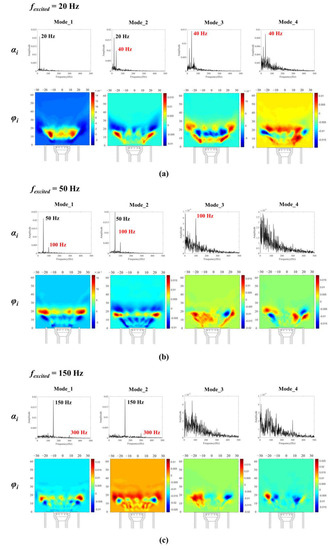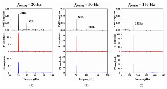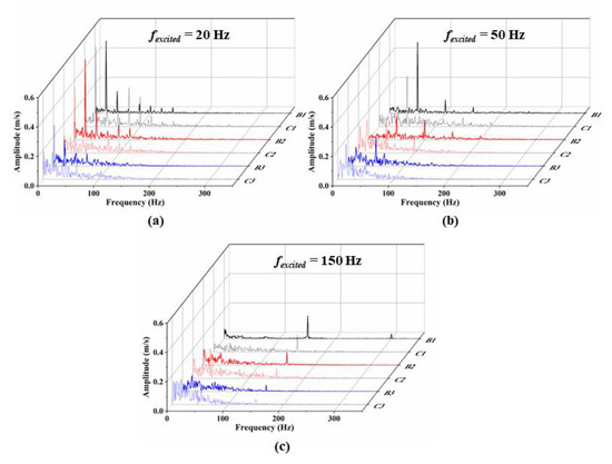 The axial velocity in the shear layers was statistically analyzed to investigate the influence of excitation frequencies on the harmonic responses, and the spectra are depicted in Figure 9. Excitation at 20 Hz resulted in a dominant response at 20 Hz, accompanied by subharmonic and multiple harmonic responses (10 Hz, 40 Hz, 60 Hz, 80 Hz, 100 Hz, and 120 Hz). Under 50 Hz excitation, responses were observed at 50 Hz, with a subharmonic response at 25 Hz and a harmonic response at 100 Hz. Similarly, under 150 Hz excitation, responses were observed at 150 Hz, with a subharmonic response at 75 Hz and a harmonic response at 300 Hz. Notably, the occurrence of multiple harmonic responses under 50 Hz and 150 Hz excitations showed a reduction in both number and amplitude compared to 20 Hz excitation.