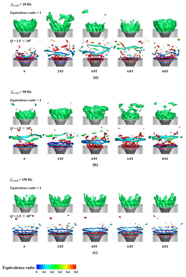 Non-premixed combustion exhibits spatially distributed heat release, which is influenced by the reactant mixing process. This section presents an analysis of the spatial response characteristics in a non-reacting flow field, shedding light on the evolution of the vortex structure and spatial distribution of the reactants under different excitations, as shown in Figure 8. Iso-surfaces set at an equivalence ratio of 1 [36] were employed to visualize the spatial distribution of the reactants at the stoichiometric ratio. The Q-criterion, described by Equation (18) [37], was utilized for identifying and quantifying vortex structures in the flow field. It relied on the nine-component velocity gradient calculation and provided a quantitative assessment of vortex morphology and intensity. An iso-surface with Q = 1.5 × 105 was used here to describe the vortex structures. Additionally, the influence of the vortex structures on the reactant mixing process was assessed by color-coding the vortex structures according to the equivalence ratio.
