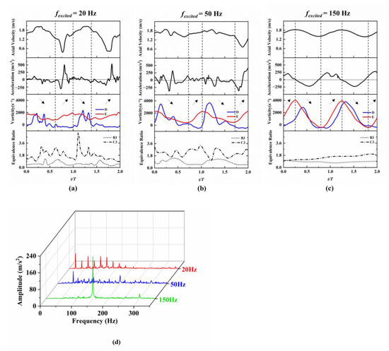 Evolution of axial velocity and acceleration at point A equivalence ratio at point B3 and C3, and vorticity at points D and E under (a) 20 Hz, (b) 50 Hz, and (c) 150 Hz excitations. (d) Spectral plot of acceleration at point A.