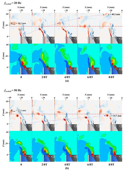 The distribution of vorticity and equivalence ratio at the y = 0 plane during one excitation period is presented in Figure 11. In the vorticity contour, the blue dashed line represents the evolution of the external vortex structure, the red dashed line represents the flame height (Hcom) measured under the respective excitation conditions experimentally, and the black solid line shows the expected flame shape under stoichiometric fraction. Significant differences in vortex generation and axial convective velocity were observed under the influence of harmonic responses to different excitation frequencies. Under 150 Hz excitation, a single vortex was formed at the inlet that underwent complete evolution, including growth, detachment, and downstream propagation. The coexistence of multiple vortices downstream of the nozzle corresponded to folds in the local equivalence ratio distribution. The expected flame height was relatively stable during the excitation period. However, under 50 Hz excitation, a larger outer vortex and fragmented smaller vortices were discernible within the excitation period. This phenomenon could be attributed to the interference of the 100 Hz harmonic response on the flow field’s reaction to the 50 Hz excitation. The motion of the larger outer vortex aligned with the fragmentation of the equivalence ratio field, and a fracture even appeared in the expected flame shape (2/8T). Under 20 Hz excitation, the vortex structure within the period became more intricate, indicating the presence of stronger harmonic responses. Compared to 50 Hz, the axial stretching and fragmentation of the equivalence ratio field became more pronounced, leading to a more complex, expected flame shape. To analyze the vortex convective transport process, the axial convective wavelength λ [46] was defined as the axial height at which the vortex propagated downstream within one excitation period. The axial convective wavelengths of the vortex under different excitations are annotated in Figure 11. By calculating the ratio of the excitation period t to the axial convective wavelength λ, the axial convective velocity Ue of the vortex could be determined, which played a crucial role in calculating the flame delay time. The vortex axial convective velocity decreased with increasing excitation frequencies, with respective values of 0.803 m/s, 0.783 m/s, and 0.496 m/s. Further calculations for the ratio of vortex axial convective velocity to the mean inlet jet velocity Uj (1.105 m/s) revealed that under excitation frequencies of 20 Hz, the axial vortex convective velocity is slightly less than the jet velocity. This supported the assumption that the vortex convective velocity was often regarded as the jet velocity [6,47]. Future research is necessary to explore the influence of flame thermal expansion on vortex convective velocity under reacting conditions. Specific values can be found in Table 3.