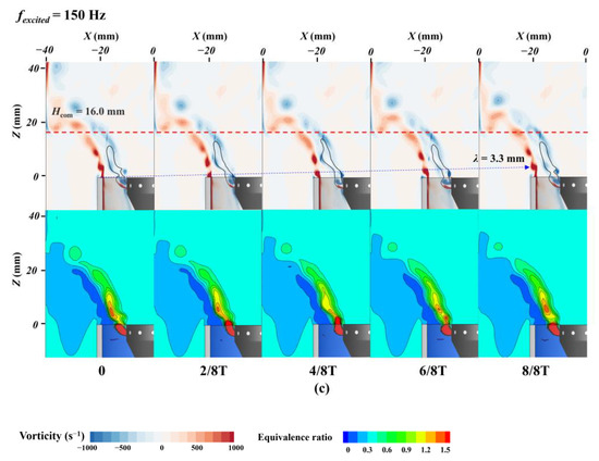 Evolution of vorticity and equivalence ratio under (a) 20 Hz, (b) 50 Hz, and (c) 150 Hz excitations.