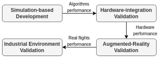 This work proposes a methodology for the development of robotic applications, aiming to optimize development time and ensure security [22]. Specifically, in the context of industrial inspection applications using aerial robots, it is crucial to minimize the test time during real flights due to the associated costs. Moreover, the robustness of the system must be guaranteed to prevent potential damage to the facilities.