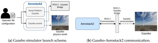 To define the simulation setup, a configuration file is used to define aerial robots and external objects. This file is then loaded by an Aerostack2 component responsible for launching the simulation. This component includes all the assets of each model specified in the configuration file as well as any ROS 2 to Gazebo bridges unrelated to aerial robots. For the aerial robots and their sensors defined in the configuration file, the Aerostack2 Gazebo platform handles the launching of the corresponding ROS 2 to Gazebo bridges. The overall scheme is illustrated in Figure 2a.