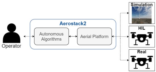 - Sanchez-Lopez, J.L.; Fernández, R.A.S.; Bavle, H.; Sampedro, C.; Molina, M.; Pestana, J.; Campoy, P. Aerostack: An architecture and open-source software framework for aerial robotics. In Proceedings of the 2016 International Conference on Unmanned Aircraft Systems (ICUAS), Arlington, VA, USA, 7–10 June 2016; pp. 332–341. [Google Scholar]