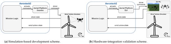 Every hardware component is simulated in the Gazebo simulator. Aerostack2 receives the data bridged from Gazebo coming from the UAV and the wind turbine. The control commands for both the wind turbine and the UAV are bridged from ROS 2 and sent to Gazebo, as shown in Figure 4a.