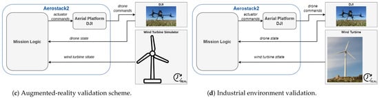 Regarding the first proposed use case, which involves the inspection of a wind turbine, ref. [18] describes how the inspection of the system is carried out while it is in operation, which is controlled by a pilot operating the UAV. However, when the aim is to automate the process, as proposed in [19], the wind turbine is stopped, and the inspection of the static blades is performed. In the mentioned work, an innovative autonomous inspection of the system while in operation is presented, which implies a higher level of safety for the developed algorithms.