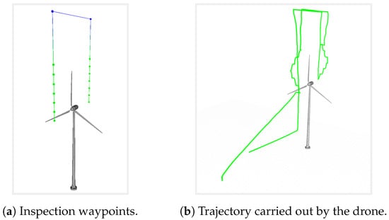 In this experiment, the inspection of a wind turbine has been carried out both on the front and rear parts of the blades. Thus, from the inertial reference point of the nacelle, the drone must follow a vertical trajectory, where it captures images at different heights. From an external reference point, the drone’s trajectory will be vertical with rotations relative to the nacelle, adapting to its rotation, as shown in Figure 5b.