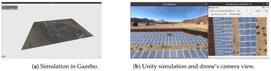 To simulate a photovoltaic plant, a 2D georeferenced model of the plant has been developed in Gazebo, shown in Figure 6a, serving as the background floor. Additionally, a photorealistic world has been designed in the Unity simulator for image capture purposes, as depicted in Figure 6b. To establish a connection with ROS 2, Flightmare [11] has been utilized.