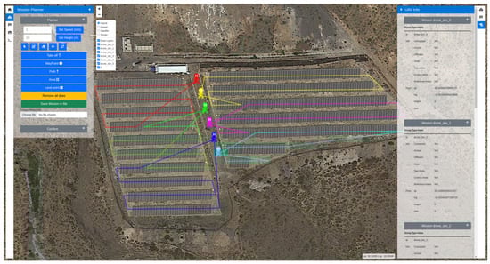 Aerostack2 Web–GUI used to plan the photovoltaic plant inspection, where the inspection paths of each UAV are displayed in different colors.