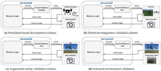 In this research, we have emphasized the necessity of developing industrial applications utilizing unmanned aerial systems in an efficient and safe manner. We have highlighted the convenience of using an incremental sim2real strategy for isolating the possible causes of failures during the development stages. The proposed methodology successfully meets these requirements and has been applied to two specific use cases: wind turbine inspection and photovoltaic plant inspection.