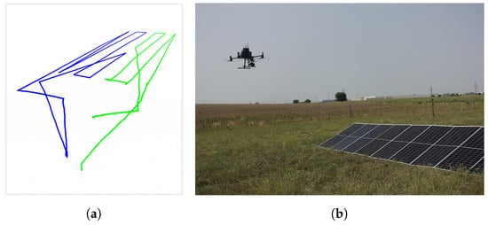 Real trajectory followed by two autonomous drones during the area inspection of a photovoltaic plant (a) and a photograph captured during the inspection, showing one of them capturing images of the photovoltaic panels (b).