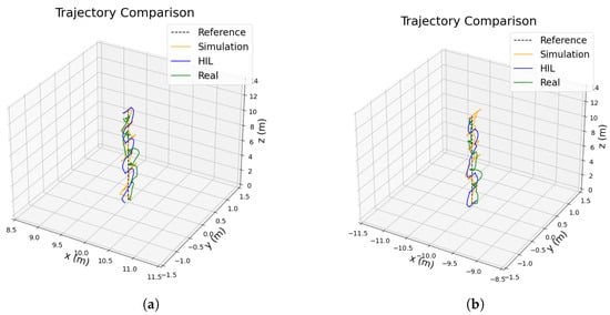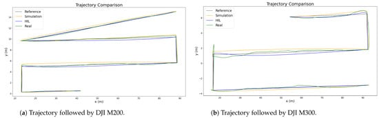 Trajectory pursued by autonomous drones during the inspection of a photovoltaic plant, employing two different models, DJI M200 (a) and DJI M300 (b), simultaneously. The figure depicts the reference trajectory for the area inspection (represented by black dashed lines), the simulated trajectory (illustrated in orange), the hardware-validated trajectory (displayed in blue), and the trajectory recorded during live flight (shown in green).