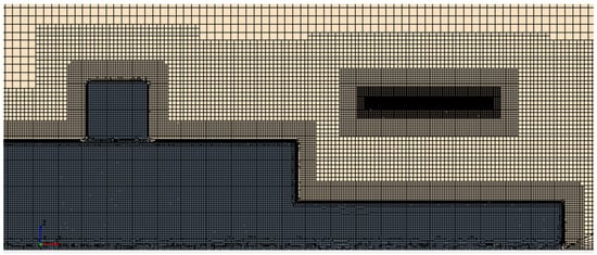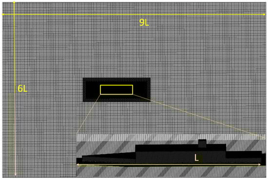 In this paper, the internationally recognized Simplified Frigate Shape (SFS2) model is employed for investigation purposes. Although certain structures, such as radar and gun, have been simplified compared to physical ships, the model still captures the essential flow field characteristics observed in real frigates. Corresponding wind tunnel tests have been carried out by several research institutions [,,,]. The SFS2 model has a total length of 138.68 m, as shown in Figure 1 (in m). The flight deck spans a length of 27.43 m, the hangar features a height of 6.1 m, and the ship has a width of 13.72 m. The model consists of 5.88 million isolated grids, which are 1242 m in length (9 times the ship length), 828 m in width (6 times the ship length) and 120 m in height in total [], as shown in Figure 2.