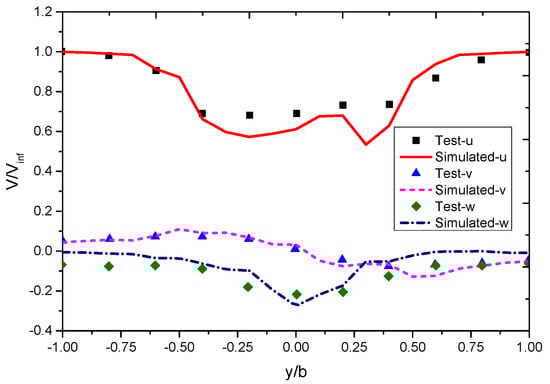 To validate the accuracy of the numerical simulation, this section examines the flow field characteristics of the SFS2 ship at a wind velocity of 20.58 m/s and a Reynolds number of 2.26 × 107. For the numerical simulation, the SIMPLEC algorithm with a second-order upwind scheme is used, and the unsteady time step is set to 0.0001 s. The velocity inlet and pressure outlet boundary conditions are considered in the simulation, including a non-slip boundary condition for the bottom (sea surface), a free outlet boundary condition for the top and side walls and a non-slip boundary condition for the hull wall surface. Figure 4 illustrates a comparison between the simulated non-dimensional velocity in the rear flow field of the flight deck and the test data []. The x-axis in the figure represents the width coordinate of the flight deck (axis position y = 0 m), and the y-axis represents the non-dimensional velocity with reference to the inflow wind velocity (20.58 m/s = 40 kn). The simulated result is the arithmetic average of the data extracted within the final second. The velocity monitoring point is set at the midpoint of the length of the flight deck, aligned in height with the top of the hangar and spanning twice the width of the deck. As shown in the figure, the simulated results agree well with the corresponding test data.