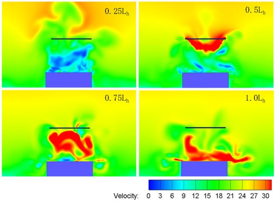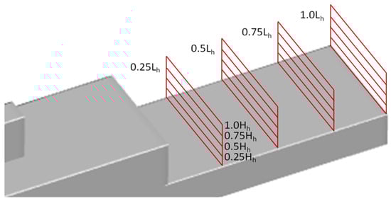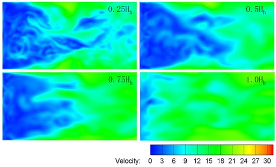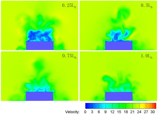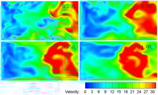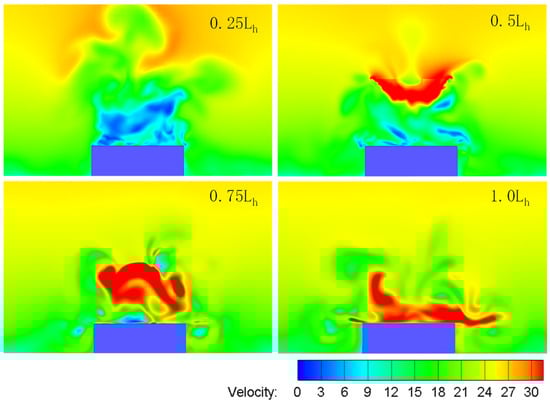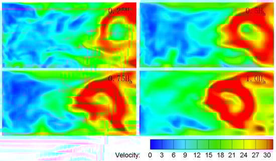 This section examines the velocity distribution at various stern heights under conditions of uniform inflow and a turbulent intensity of 5% (Case 1). In the stern velocity monitoring section as shown in Figure 5, Lh represents the length of the flight deck, and Hh represents the height of the hangar.