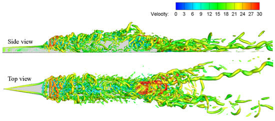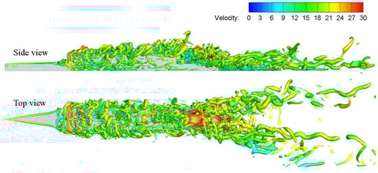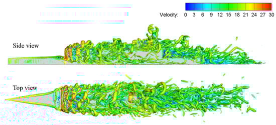 According to the Q-criterion distribution (Q = 5) shown in Figure 12, the vortex distribution in the flight deck position is richer than the wake vortex distribution of an isolated ship due to the presence of the rotor wake vortex, which has a longer vortex evolution zone and a λ-shaped distribution, because the weaker strength of the wake vortex relative to the blade tip vortex means it is more susceptible to being sucked into the latter. Additionally, the higher energy (represented by greater velocity) associated with the rotor blade tip and the induction of the tip vortex lead to the absorption of the detached eddy in the wake zone by the blade tip vortex, as shown in Figure 13 (Q = 50). Therefore, compared with an isolated ship, the separation vortex is more intense and, consequently, influences a larger zone.