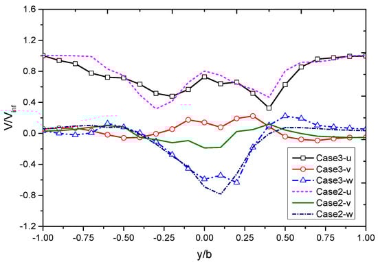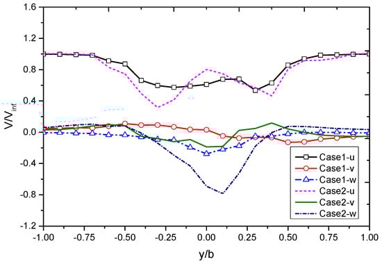 The velocity distribution in different directions at the hangar height under wind shear conditions, as shown in Figure 17, reveals minor velocity fluctuations in different directions, with a smaller velocity deficit compared to uniform inflow conditions. The reduced velocity fluctuations in different directions can primarily be attributed to the velocity gradient induced by wind shear, which facilitates more rapid energy exchange between different height positions and aids in velocity recovery.