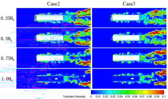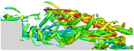 The Q-criterion distribution (Q = 5) shown in Figure 18 reveals that the induction of the tip vortex results in the absorption of turbulent vortex in the wake zone by the tip vortex, reducing the occurrence of detached eddies behind the deck axis. When comparing the wake characteristics of Case 2 and Case 3, we find that the detached eddy behind the hangar under wind shear conditions is considerably weaker compared to uniform inflow conditions, as indicated by the black circle in Figure 19 (Q = 50). This reduced detached eddy is possibly attributed to the additional viscosity generated by wind shear, which leads to the quick decay of the eddy.