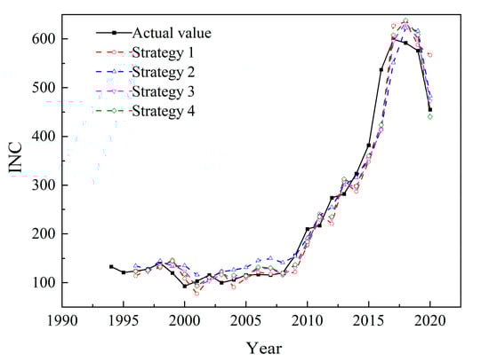 We conducted an in-sample forecast method to project the INC values from 1994 to 2020, using models from the four strategies. The goal was to assess how well the models fit the data by comparing the discrepancies between the fitted values and the actual observed values. The Mean Absolute Error (MAE), Mean Absolute Percentage Error (MAPE), and Root Mean Square Error (RMSE) are the performance metrics used.