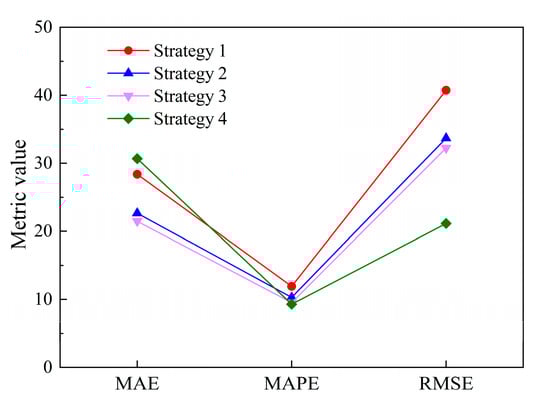 For Strategy 4, the Causal-ARIMA model is employed to project variables that are highly correlated but have no apparent causal relationship. Although this strategy’s MAPE and RMSE values are lower than those of the other strategies, it falls short of the baseline model (Strategy 1) in terms of its MAE. Therefore, fits made within a narrow range may suffer due to a higher MAE. This indicates that using the Causal-ARIMA model for variables that are purely correlated without distinguishing for causality can result in unbalanced performance. Consequently, caution is needed when using the Causal-ARIMA model as it does not offer a comprehensive advantage in fitting variables that are merely correlated.
