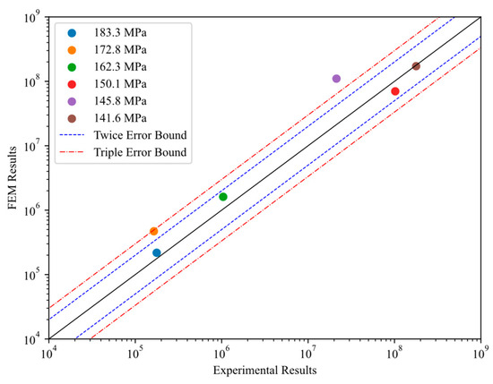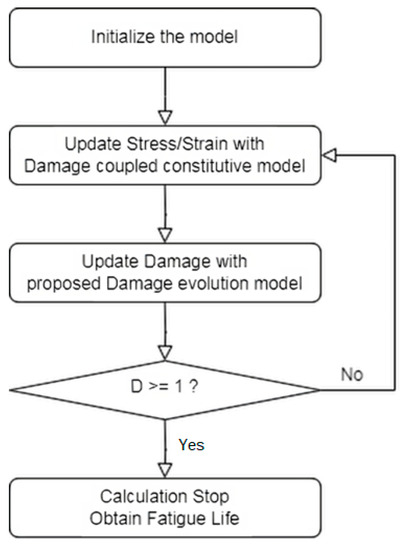 - Check if damage at any integration point exceeds 1. If so, terminate the calculation and output the fatigue life. Otherwise, return to step 2 and repeat. It is clear from Equation (3) that the elastic modulus of the material will drop to 0 once the damage exceeds 1, and this is considered crack initiation.