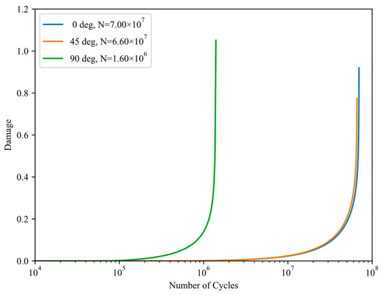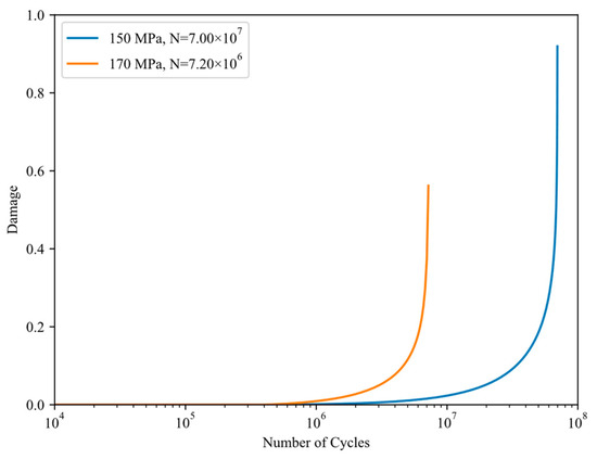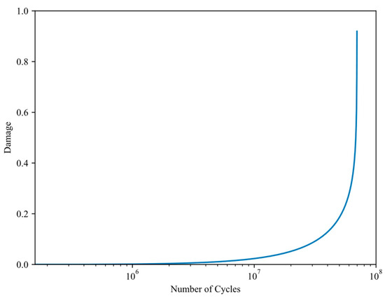 - Calculate and update the damage rate at each integration point according to the proposed damage model. To save computational time, assume that the damage accumulation is linear in cycles. The damage increment will be , and is updated at each integration point;