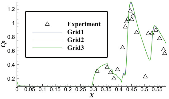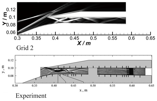 Figure 2 shows the Mach contour of the GK-01 inlet calculated by an unstructured CFD solver. The three shockwaves interfered near the inlet lip. There is a small flow separation near the inlet throat. A comparison of the calculated and experimental values of the pressure coefficient on the compression surface is shown in Figure 3. The fluid field is calculated with three different grid densities to test the grid convergence of the CFD computation in this study. Grid 1 represents a coarse grid, which has grid cells. Grid 2 is a medium grid and has grid cells. Grid 3 is a fine grid and has grid cells. The CFD results are in general agreement with the experimental results. The obtained results are also similar for the different grid densities, indicating good grid convergence. A grid density similar to the medium grid is applied in the following computation. Figure 4 shows the shockwave structures of the inlet, both CFD for Grid 2 and the experiment. It shows that the middle grid captures most of the shockwave structures in the hypersonic inlet.