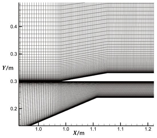 After the sampling process, the flow fields of the samples in the dataset are computed by the CFD solver. The grid block partition is shown in Figure 6. The entire inlet flow field is divided into four grid blocks according to geometry. The grid points of the four blocks are 250 × 100, 150 × 100, 150 × 120, and 250 × 120. Figure 7 shows the grid detail around the inlet lip. The grid is appropriately refined in the boundary layer.