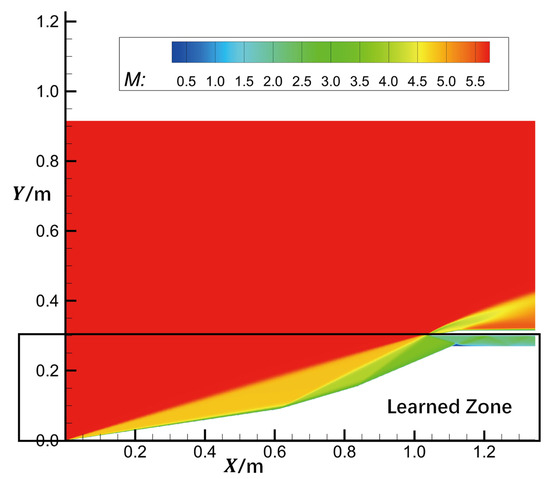 The incoming flow conditions for the dataset computation are listed in Table 3. We chose to train the model with incoming Ma 6 for engineering needs. The CFD method has been verified by a comparison with the experimental data of the GK-01 model with incoming Ma 7. Although the Mach numbers are different, the results may still be reliable enough, as done in Ref. [27]. Figure 8 shows the flow field of sample ID-001. Figure 9 shows the y+ value on the compression surface of sample ID-001. Since the k-ε model is adopted in this paper with a wall function, the y+ value is passable for our calculations. A black box is marked in the figure, which is the flow field zone used for machine learning training and testing. The VAE method proposed in this paper can be applied on any part of the flow field, while we only consider the flow captured by the inlet to improve the training efficiency. A total of 399 × 100 grid points are used for training.