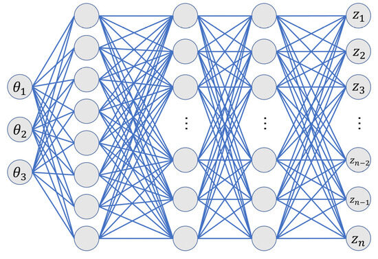 In this study, the number of neurons in the input layer is three, corresponding to the three wedge angles, and the number of neurons in the output layer is the same as the dimension of the VAE coding features. Three hidden layers of 8, 32, and 32 neurons are adopted in the MLP model. The structure of the MLP network is shown in Figure 11. MSE_LOSS is used as the loss function of the MLP model, and its expression is shown in Equation (7).