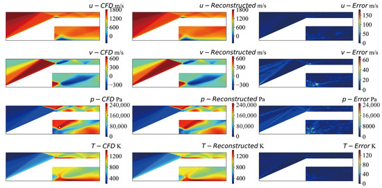 Figure 14 and Figure 15 show typical flow fields for the individuals in the training and testing sets, respectively. Each plot contains twelve subplots, which can be divided into four groups. The subplots in the four rows are the maps of the u velocity, v velocity, static pressure and temperature . The three subplots in each row from left to right are the flow field calculated by CFD, the reconstructed data based on the VAE model, and the absolute error between the CFD and VAE, respectively. We can see that the calculated and reconstructed flow fields are similar in most regions, and the errors are relatively high near shockwaves.