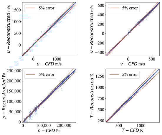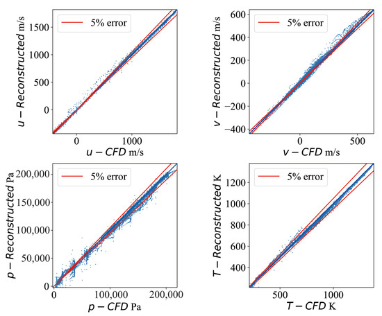 Figure 16 and Figure 17 show the corresponding scatter plots of the flow fields, and each scatter represents the flow data at a grid node. The horizontal coordinates are the values calculated by CFD, and the vertical coordinates are the values reconstructed by VAE. The red lines are the lines of the ±5% errors. We can see that most of the scatters are located inside or near the lines of the ±5% errors. The reconstruction accuracy of the static pressure and vertical velocity has a larger error than the other flow variables. It is consistent with the results in Figure 14 and Figure 15. The vertical velocity and pressure undergo a sudden change besides a shockwave, which makes these two quantities more uneven and discontinuous in spatial distribution.