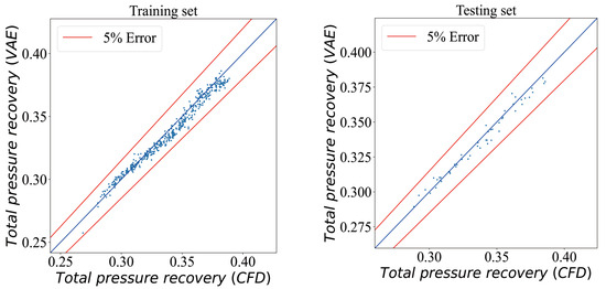 The error distribution of the total pressure recovery of the predicted flow field is given in Figure 24, where the left plot is the training set, and the right plot is the testing set. Each scatter represents an individual sample. The horizontal coordinates are the values obtained from CFD computations. The vertical coordinates are the predicted values given by the VAE-MLP model, and the red lines mark the range of the ±5% errors.